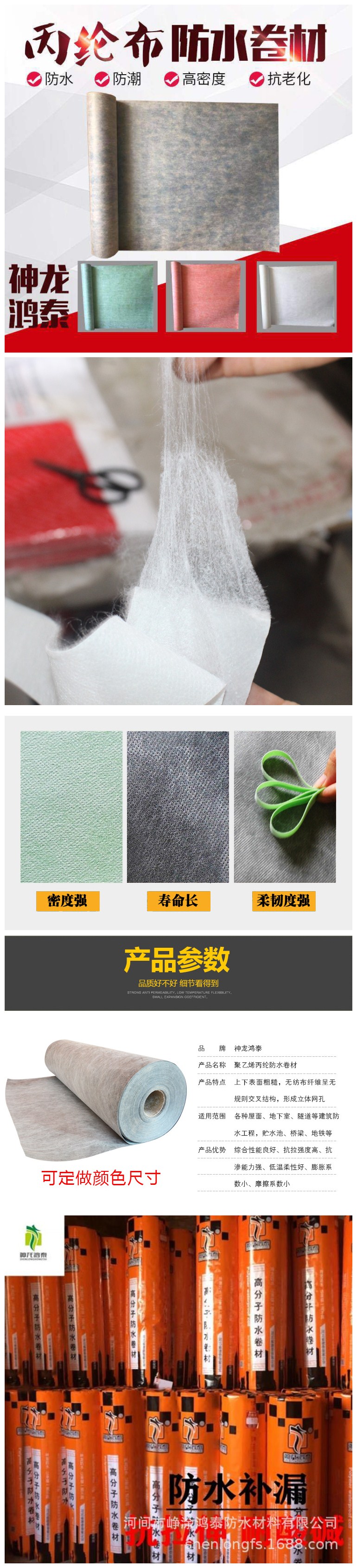 高分子聚乙烯丙綸(滌綸)防水卷材是采用聚乙烯、高強(qiáng)丙(滌)綸無紡布、紫外線隔光劑、抗老化劑等高分子原料,自由化生產(chǎn)線一次性擠出成型加工制成。卷材中間層是防水層和防老化層,上下面是增強(qiáng)粘結(jié)層,牢固、可靠、無翹邊、無空鼓,雙層防水,是一種新型防水材料。