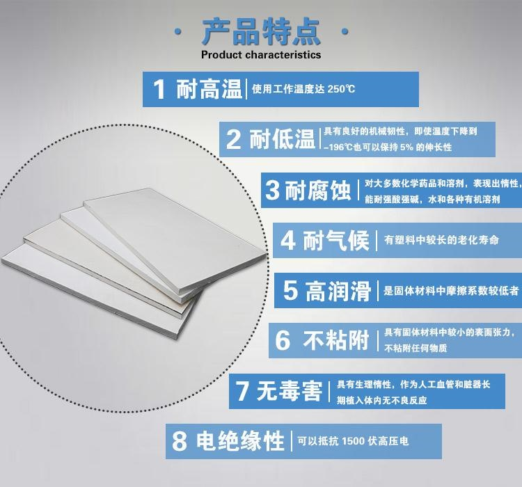 聚四氟乙烯板(也叫四氟板,鐵氟龍板,特氟龍板)分模壓和車削兩種,模壓板是由聚四氟乙烯樹脂在常溫下用模壓法成型,再經(jīng)燒結(jié)、冷卻而制成。聚四氟乙烯車削板由聚四氟乙烯樹脂經(jīng)壓坯、燒結(jié)、旋切而成。其制品用途廣,具有極為優(yōu)越的綜合性能:耐高低溫(-192℃-260℃)、耐腐蝕(強(qiáng)酸、強(qiáng)堿、王水等)、耐氣候、高絕緣、高潤滑、不粘附、無毒害等優(yōu)良特性。