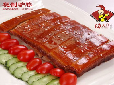 后來小德張去世將店面交給他的得力伙計張實誠經(jīng)營,張實誠老后又將店傳給徒弟張子華,張子華聰敏好學,人品一流,當時在尊祖莊一帶流傳著一個誠信的故事:張家的油不稱李家的錢不數(shù)。這是西城固莊一個李姓人家經(jīng)常來張子華的店里買驢油,每次都是提前把油裝好,李家來拿油放下錢就走,張子華也不數(shù)是多少錢就放進錢箱,張家的油從來不會缺斤短兩,李家也從來不會少給錢,長期以來形成信任,后來張家李家還做了親家。除了誠信經(jīng)營張子華在制作工藝上也摸索出了很多前人沒有嘗試過的方法。以前沒有冰箱,加工出來的驢肉無法長期保存,夏天賣不掉一天就壞了,只能扔掉,這樣無形中就增加了很大的成本。張子華在地里采來野麻(野麻是北方很常見的一種草本植物,麻繩提豆腐中的麻繩就是用野麻的皮做的)的葉子把加工好涼透的驢肉包好,外面用麻繩系住,然后放到七八米深的地窖里,這樣就可以保存七八天不會變質(zhì),沒想到這種包裝還有一種神奇的效果,經(jīng)過野麻葉子包裹幾天的驢肉味道更加鮮美清香,成功的解決了儲存問題開店就輕松多了。1937年日本鬼子入侵,尊祖莊一帶尤為嚴重,建了好多炮樓,鬼子們吃過驢肉火燒也愛上了這一口,后來地下黨漸漸打出了名聲,鬼子兵平常不敢出炮樓,就讓張子華給送到炮樓里面去,張子華天生膽小,打雷天都不敢去關(guān)窗戶,哪里敢去鬼子的炮樓,和地下黨接觸后,在他們的鼓勵下才為了民族大義開始頻繁的進出鬼子的活動地送驢肉火燒,給地下黨傳遞出很多有價值的情報。解放后張子華五個兒子都相繼有了不錯的工作,這個驢肉火燒店一直找不到合適的接班人。直到2006年3月,張子華之孫張海濤先生接手經(jīng)營驢肉火燒店,張海濤以老店祖?zhèn)骷夹g(shù)為基礎,結(jié)合現(xiàn)在科學飲食制作經(jīng)驗,獨創(chuàng)十九種特殊制作工藝,從驢的宰殺、驢肉的處理、驢肉的煮制、面粉的選用、和面的技巧,火燒的檊制、香燜的制作、湯汁的調(diào)制無不精益求精。為達到更科學的管理和發(fā)展,2008年張海濤成立了河北瀛韻留香管理有限公司。并注冊了一個時尚的品牌“功夫驢”以打入各大中城市市場,幾百年的發(fā)展完善,從只為果腹的廉價“大火燒加驢肉”一直發(fā)展到如今擁有工業(yè)化流程,標準化操作的現(xiàn)代化股份公司。功夫驢視質(zhì)量如生命,從驢源的選擇、火燒加工、出品的時間,都設置了規(guī)范流程,確保了品質(zhì)的安全和統(tǒng)一。功夫驢卡通造型活潑、可愛,擺出中國功夫Pose的小驢,既彰顯出中國傳統(tǒng)文化又寓意功夫驢驢肉制作的精細繁雜和功夫驢驢肉的非凡功效。背景的折扇,體現(xiàn)了文化、傳統(tǒng)和高貴。剛勁瀟灑的毛筆字加上印章更將中國的傳統(tǒng)精髓體現(xiàn)的淋漓盡致。“做地道中國味道”是功夫驢得以生存發(fā)展的根本,在制作過程中一個人要熟練的把十六七斤活好的面粉搟片、抹油、抻長、卷條、揪劑、兩面包皮,烙制、烘烤、出鍋、加肉,一次做出一百多個火燒,可謂一絕。