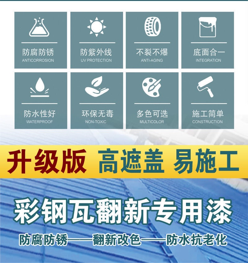 | 顏色(可調(diào)) | 施工法式刷涂、輥涂、噴涂 | 適用范圍彩鋼瓦、石棉瓦、集裝箱、廠房頂棚、鋼制門(mén)窗 |