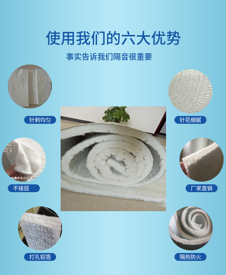 三、20mm針刺毯隔聲板的特點(diǎn) 針刺毯隔聲板單絲無(wú)序交錯(cuò)穿插,呈無(wú)定向三維微孔結(jié)構(gòu),空隙小,空隙率高,具有良好的吸音、減震、耐腐蝕、絕緣、耐高溫、阻燃的性能。